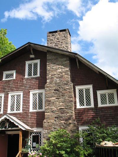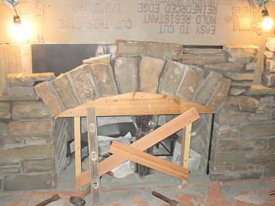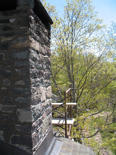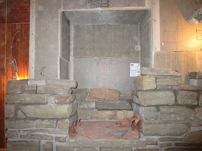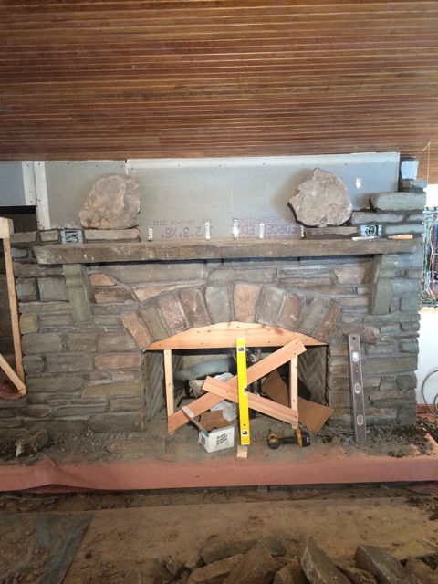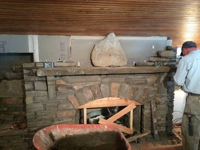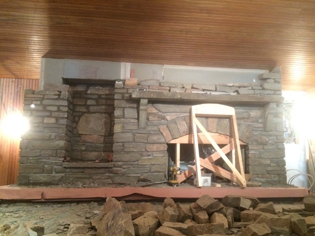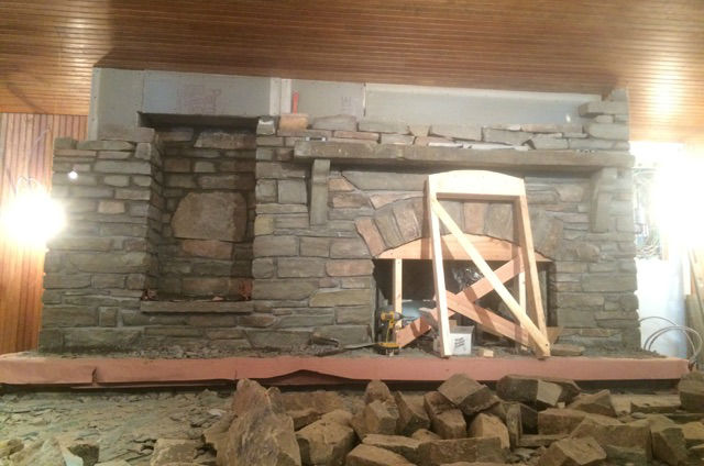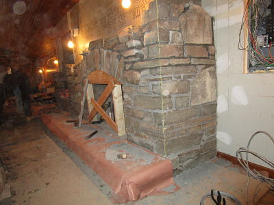 The Deer Mountain was getting a major facelift. New and remodeled guest rooms, a third floor rec. hall and many other features. Cassella Construction Corp. was awarded the masonry restoration of the chimnies and new fireplace construction. As seen in the above photo, progression to cieling height.