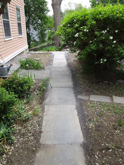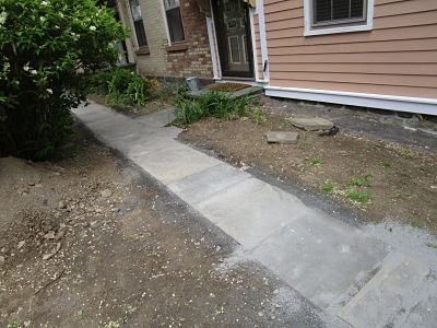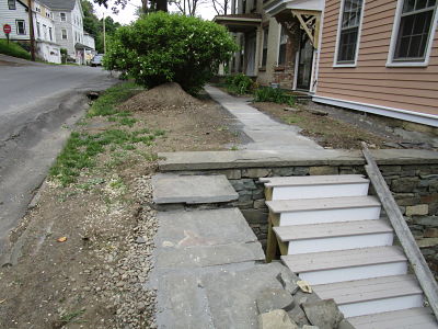 Renaissance Custom Builders was giving The Flannery residence a new facelift with siding, windows and trim circa the era it was built. There were drainage problems and leaks, Renaissance hired Cassella Construction Corp. to dismantle the deteriorated retaining wall and rebuild with existing and new stone. We also chipped out masonry joints in the basement and tuck pointed with a lime based mortar. As seen in the photo above, view of new retaining wall from the street.