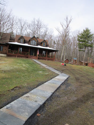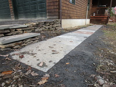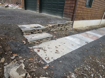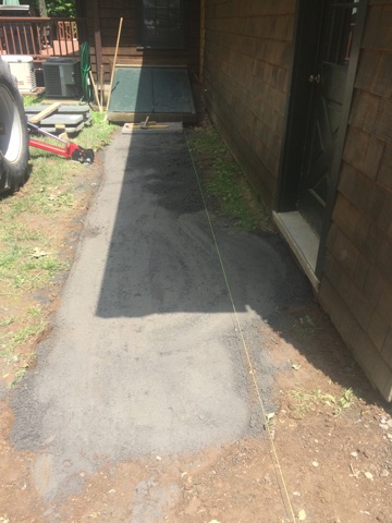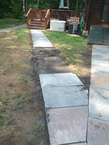 My long time aquaintance, contractor needed new walkways at his residence. He designed and laid out the dimensions. I went to work excavating and preparing the sub-grade. I installed the stone dust and a final compaction and began setting the blue stone slabs.