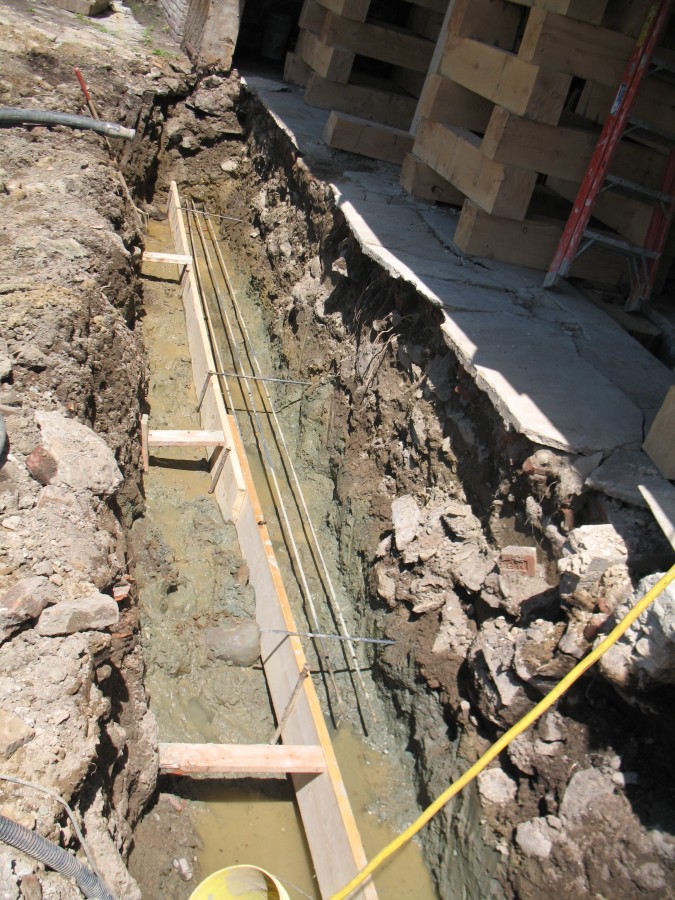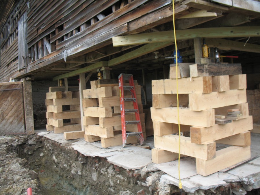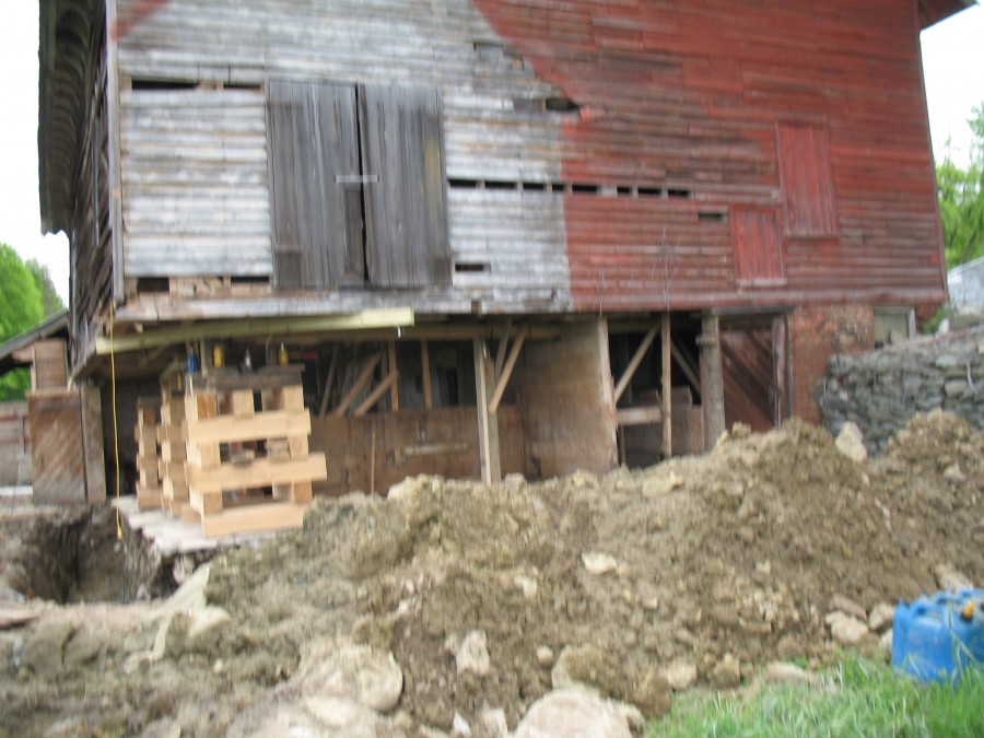 The Striefenador barn was constructed in the late 1700s. It had a common brick foundation laid up in lime mortar cement. During excavation it was discovered that it did not have an adequate footing. Excavation then continued to frost line, forms were installed, and a re-enforced concrete footing was poured. The re-building was laid up in concrete block to reduce labor and material cost. As seen in the photo above, south elevation view of finished walls.