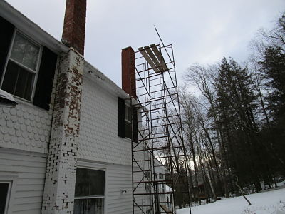 The Superintendent of the Park invited Cassella Construction Corp. to bid on an Estate being handled by a Law Firm from Maine. We won the bid and proceeded with the restoration process. One brick chimney had to be torn down to the roof line. It was rebuilt with new brick set in fresh mortar cement, and flashed at the roof line. The other chimney was tuck pointed, and a steel collar installed with a steel brace to the roof. As seen in the above photo, newly completed brick chimney for the estate.
