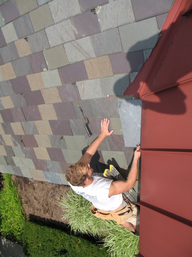 The winter go 2010-11 left many roofs with ice and snow damage. Even a rugged slate roof does not escape the brutality of the ice. As seen in the above photo, new slates installed, eave of Yullman Theater.