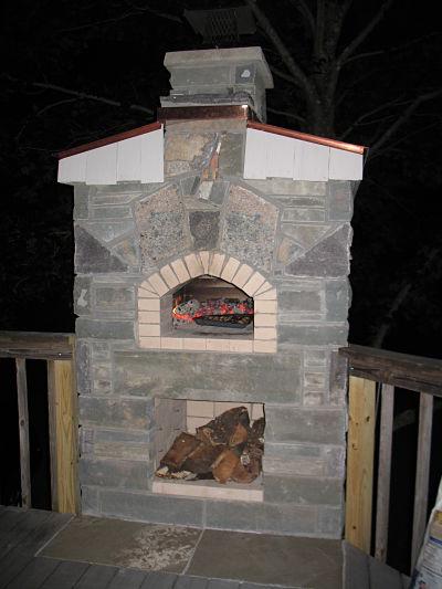 The owners had desired a barbeque or pizza oven for outdoor entertaining, but because of location had put it off for some time. Finally they decided to go ahead with the project, building by the deck for convenience, but it had to be fourteen feet high to meet the deck height. They have enjoyed using the oven immensely. The core construction was concrete block, brick oven and stone veneer finish, Corinthian granite and blue stone bars with raked joint. Oven was highly insulated and then roof framed and finished with copper standing seam roofing.